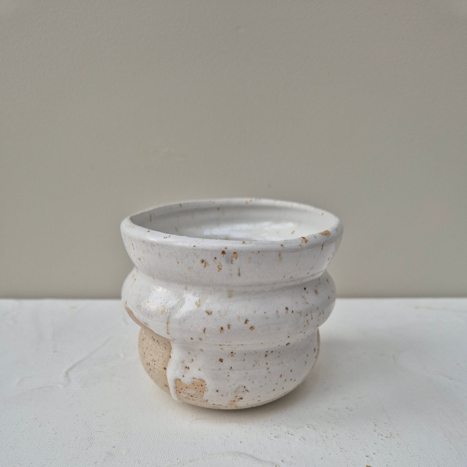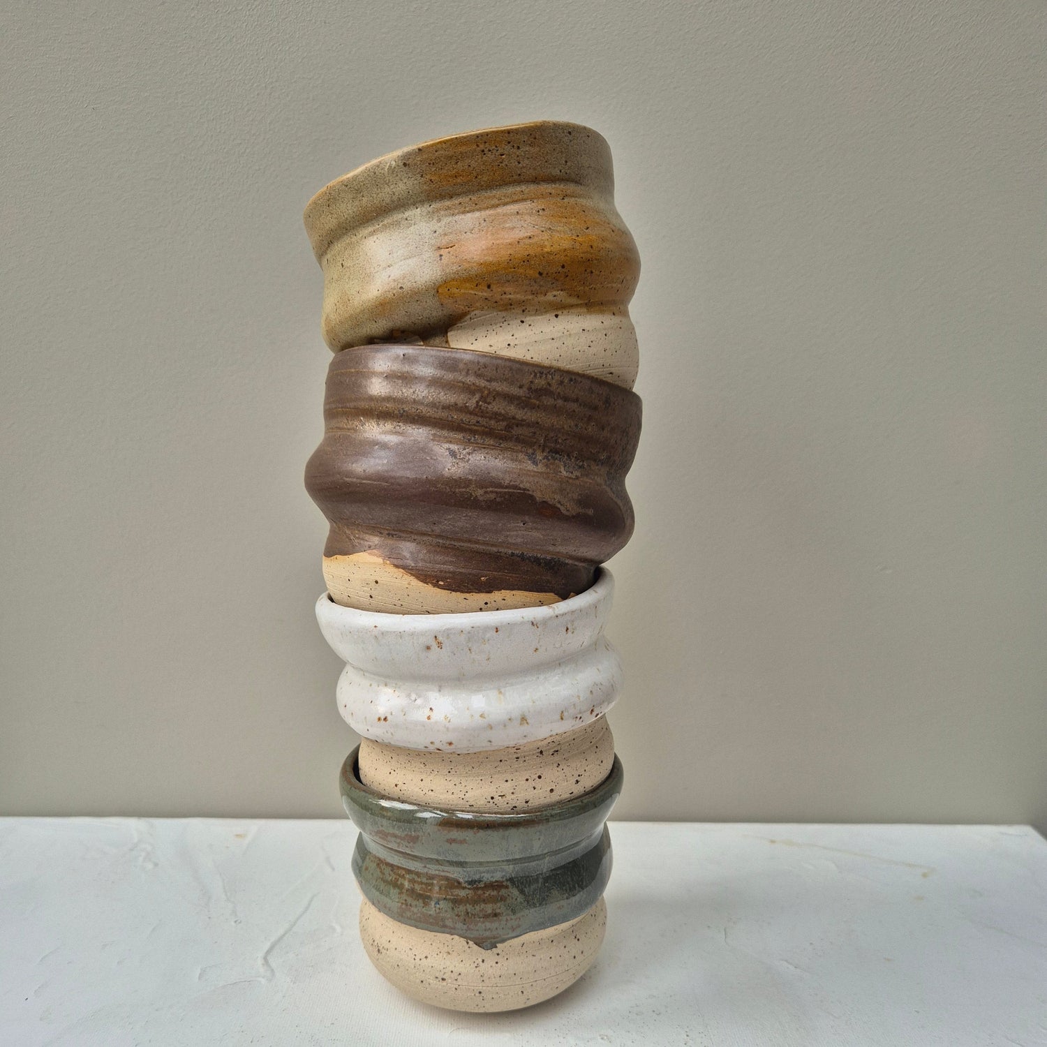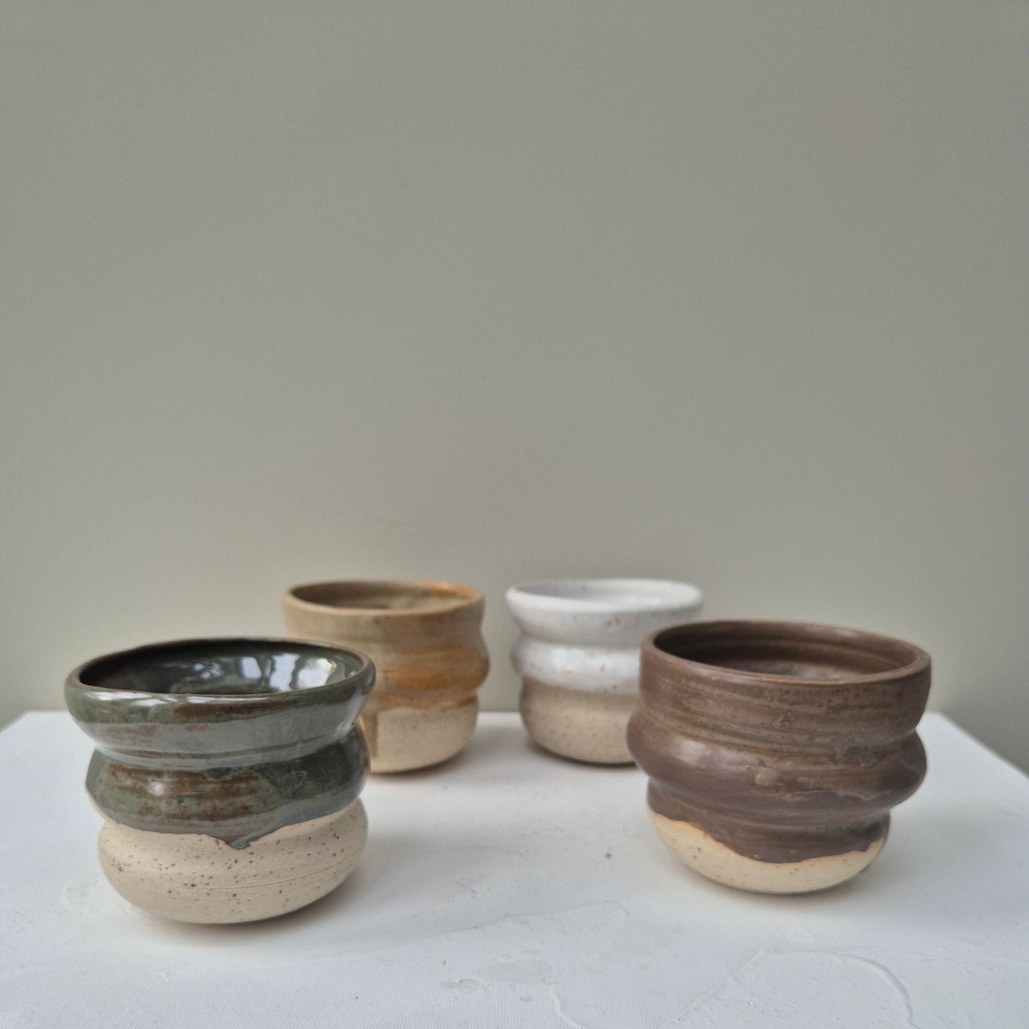 Cups made in speckled clay and partly dipped in different colors and left to drip randomly.