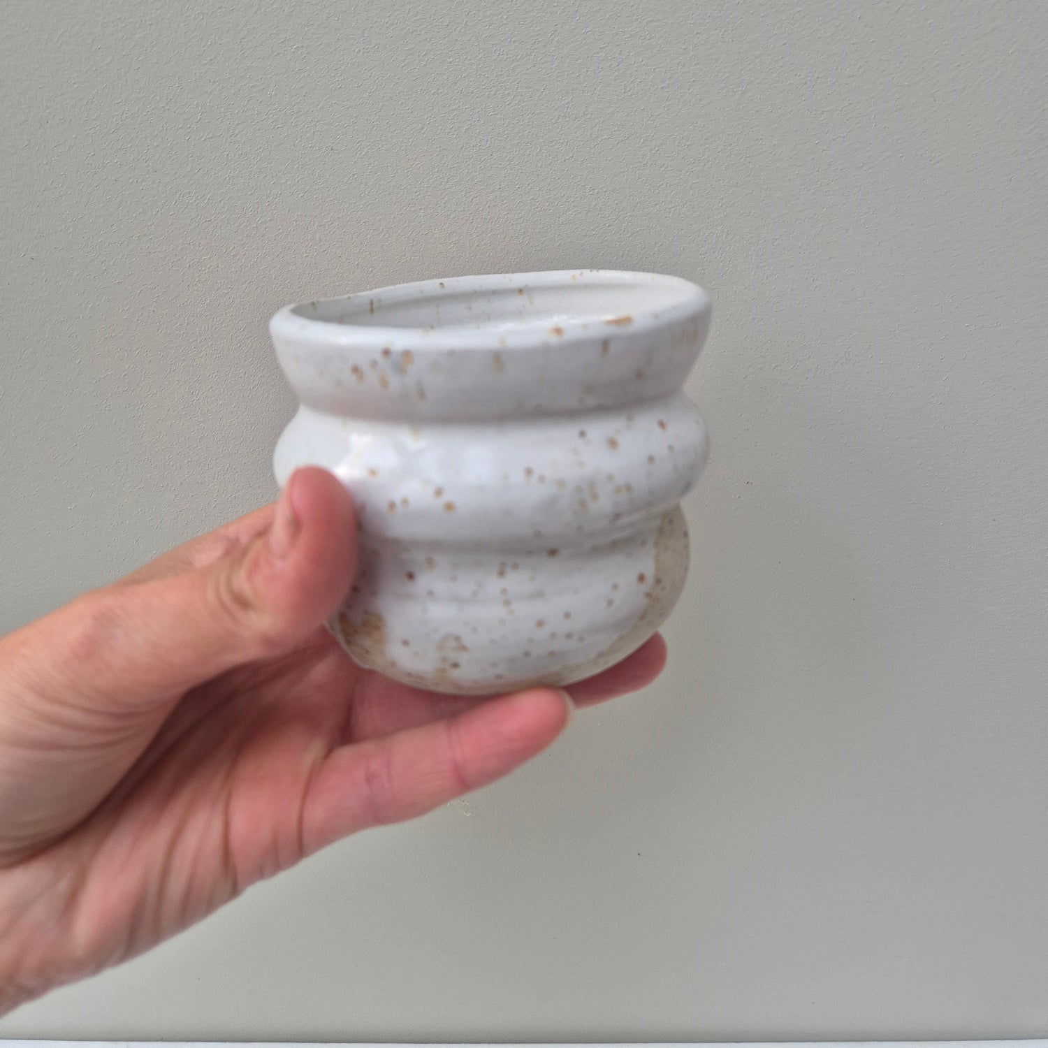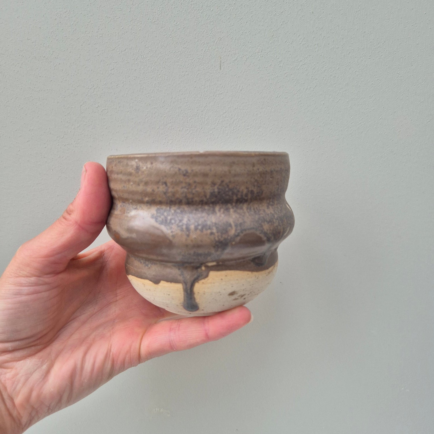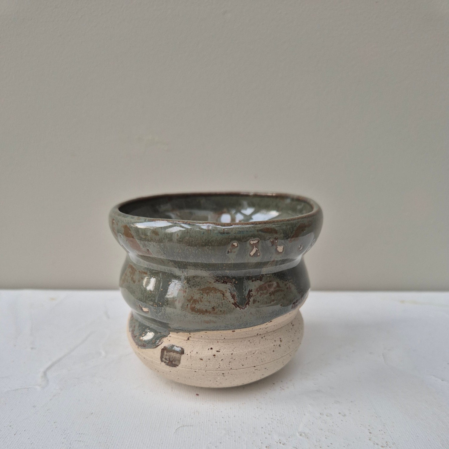 Cups made in speckled clay and partly dipped in different colors and left to drip randomly.